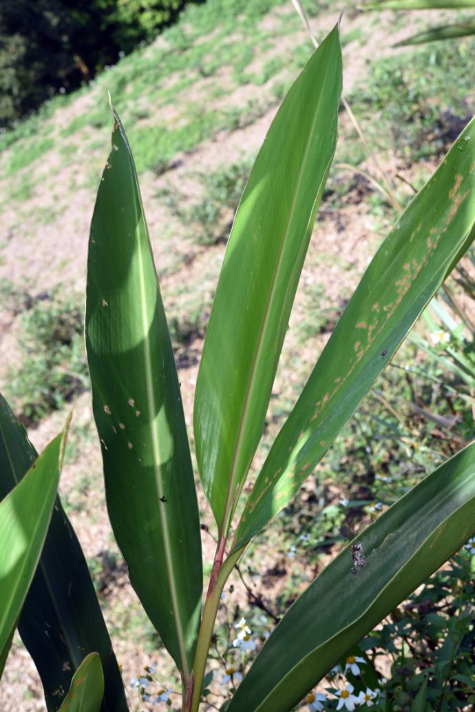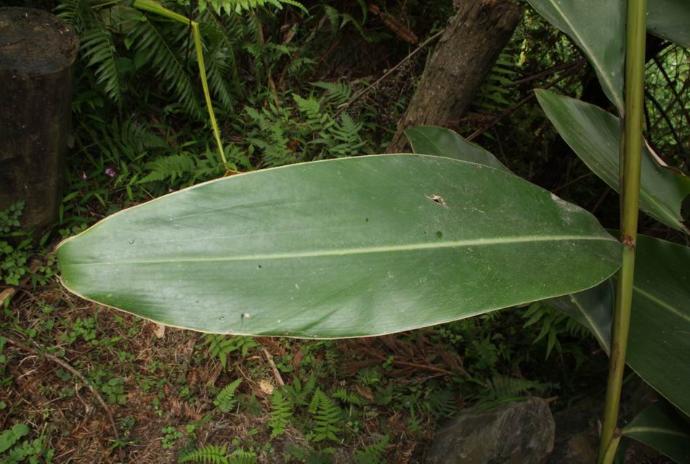 單葉互生,葉長橢圓形,葉基下延成鞘。先端漸尖。