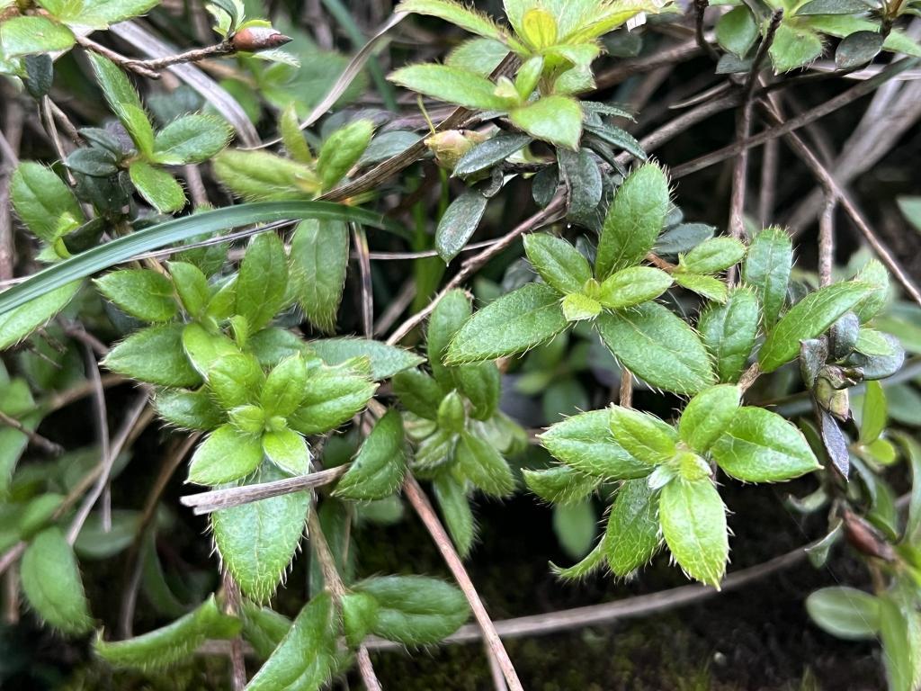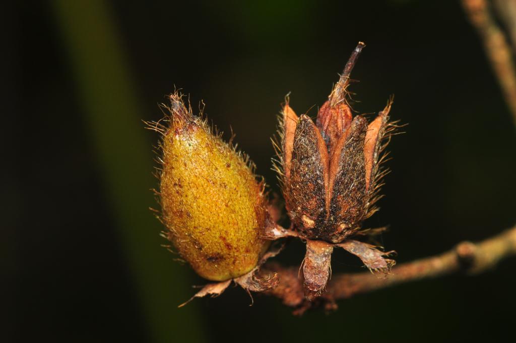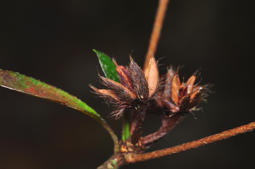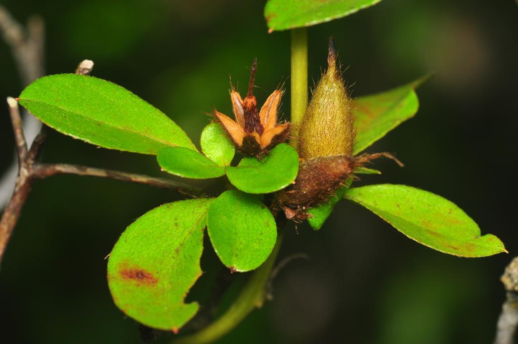 灌木,幼枝密被灰色或褐色伏刺毛。葉橢圓狀披針形至卵狀橢圓形,長 2 ~ 5 公分,上表面疏被刺毛,下表面脈上被刺毛。花 2 ~ 6 朵簇生於枝端,紅色或深紅色,雄蕊 7 ~ 10。