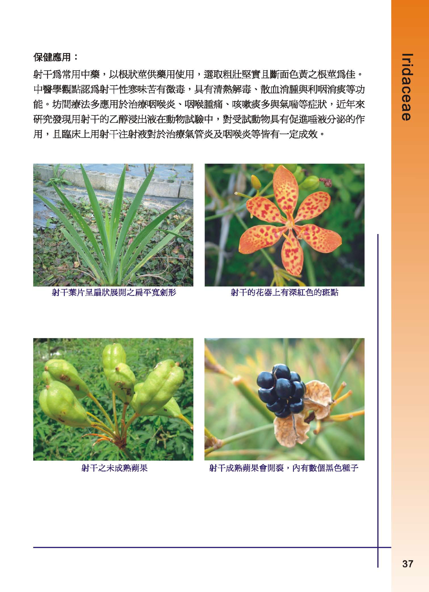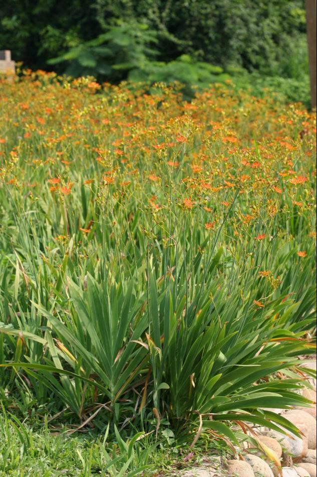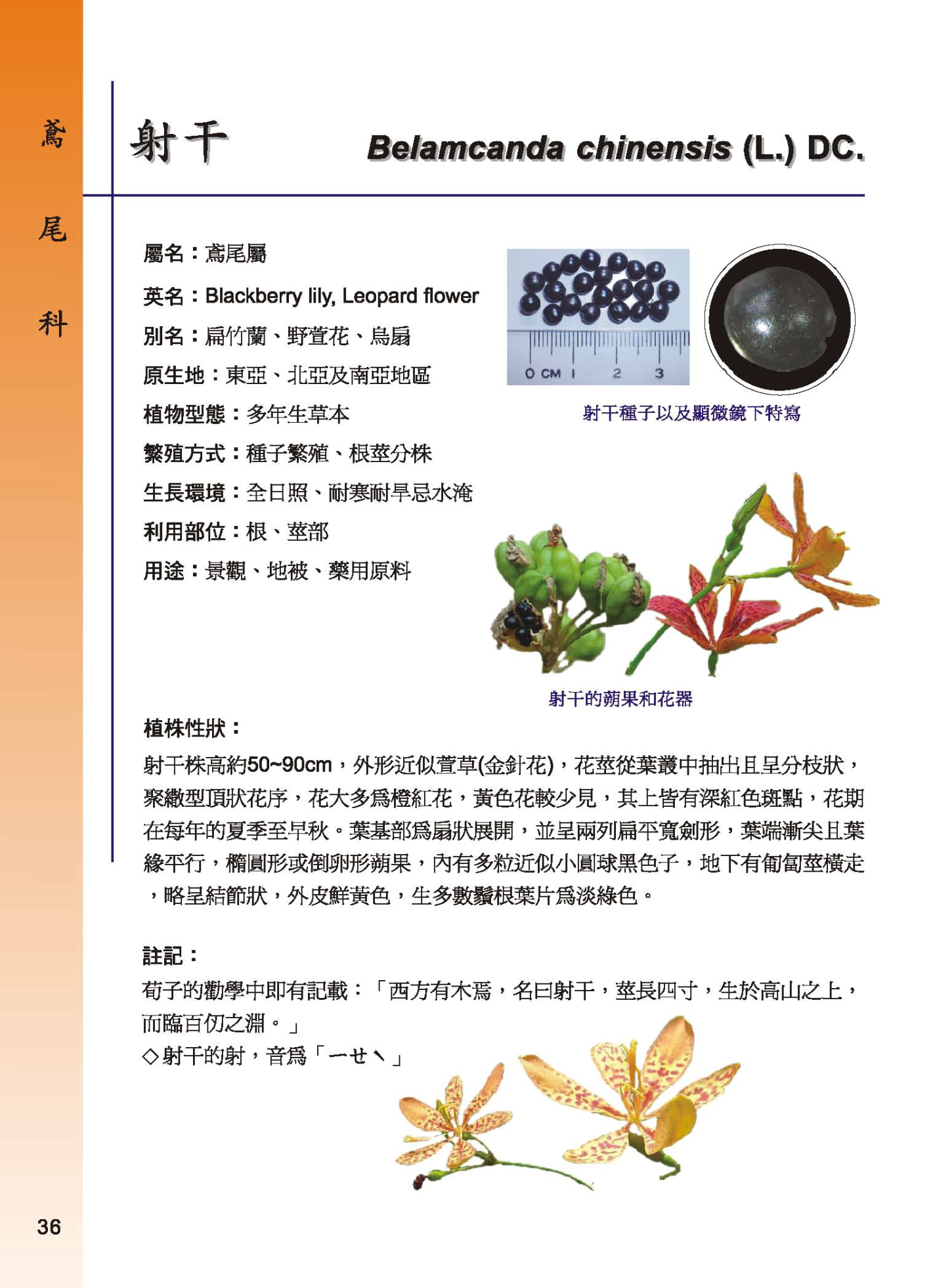 多年生草本,具肉質地下莖;莖長 50 ~ 100 公分。葉數片,劍形,二列排列,葉長 30 ~ 60 公分,寬 2 ~ 4 公分,無中肋,具平行脈,全緣,綠色,長帶白粉,兩面光滑無毛,質硬。花被片長橢圓至狹橢圓形,下表面黃色,基部深紅色,上表面橘紅色,具深紅色斑點。果倒卵狀橢圓形。應紹舜氏曾發表 Belamcanda chinensis (L..) Redoute var. taiwanensis S.S Ying (台灣射干),作者赴模式標本採集地和平島觀察研究,發現此植物與原變種射干並沒有顯著差異。