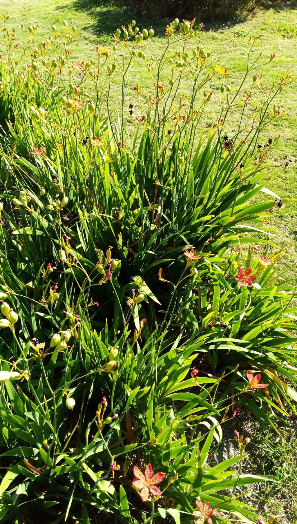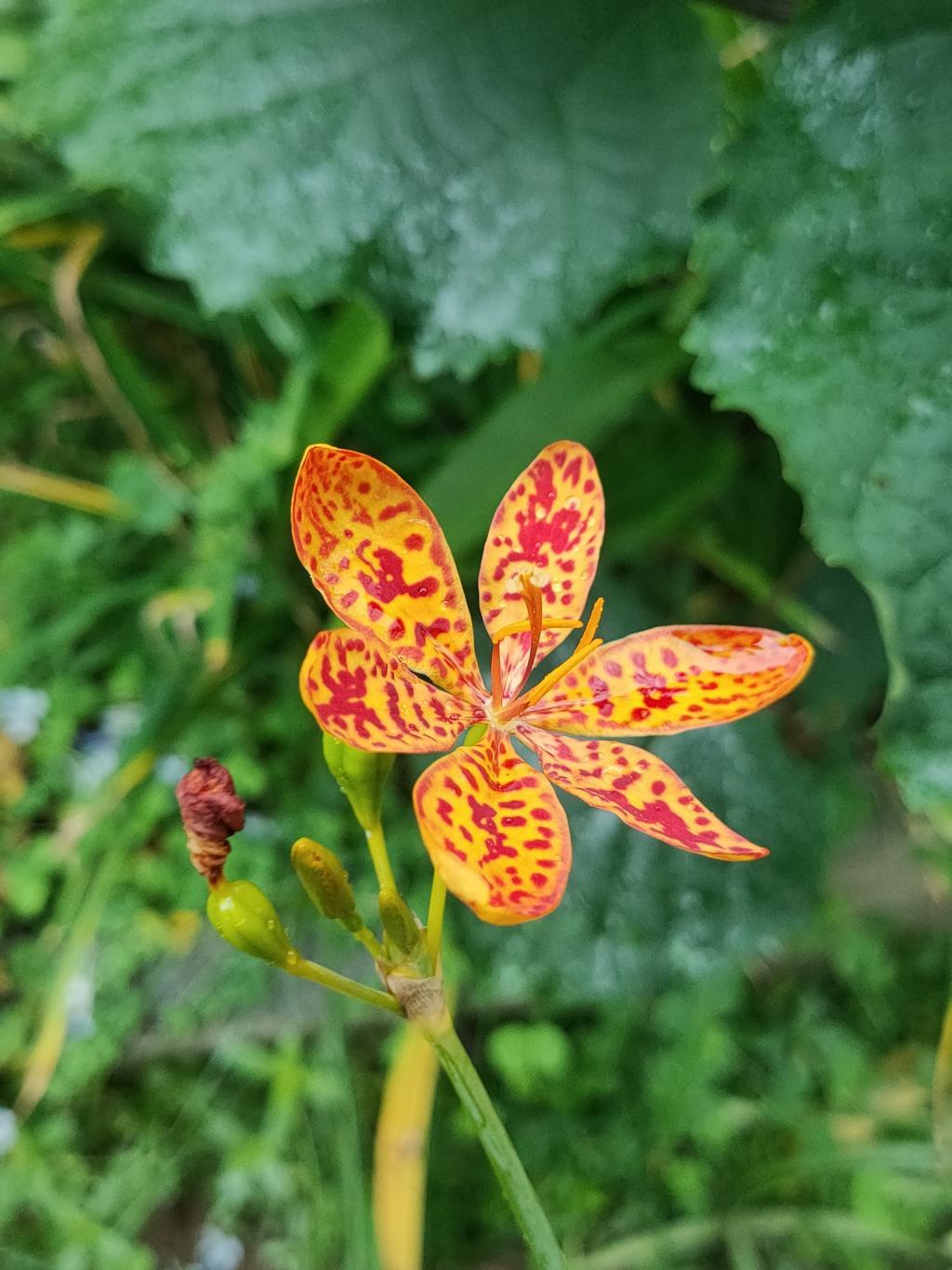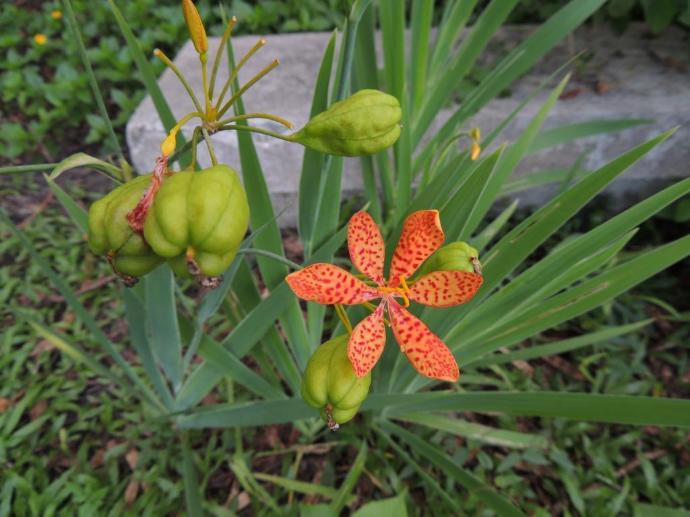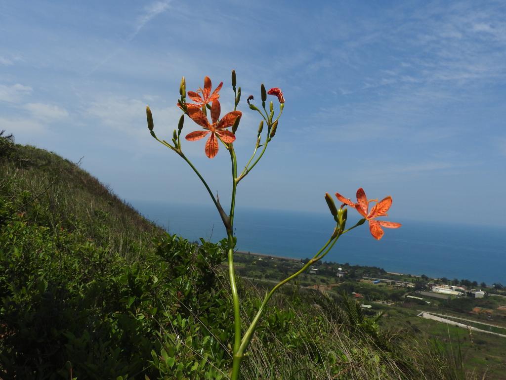 多年生草本,具肉質地下莖;莖長 50 ~ 100 公分。葉數片,劍形,二列排列,葉長 30 ~ 60 公分,寬 2 ~ 4 公分,無中肋,具平行脈,全緣,綠色,長帶白粉,兩面光滑無毛,質硬。花被片長橢圓至狹橢圓形,下表面黃色,基部深紅色,上表面橘紅色,具深紅色斑點。果倒卵狀橢圓形。應紹舜氏曾發表 Belamcanda chinensis (L..) Redoute var. taiwanensis S.S Ying (台灣射干),作者赴模式標本採集地和平島觀察研究,發現此植物與原變種射干並沒有顯著差異。