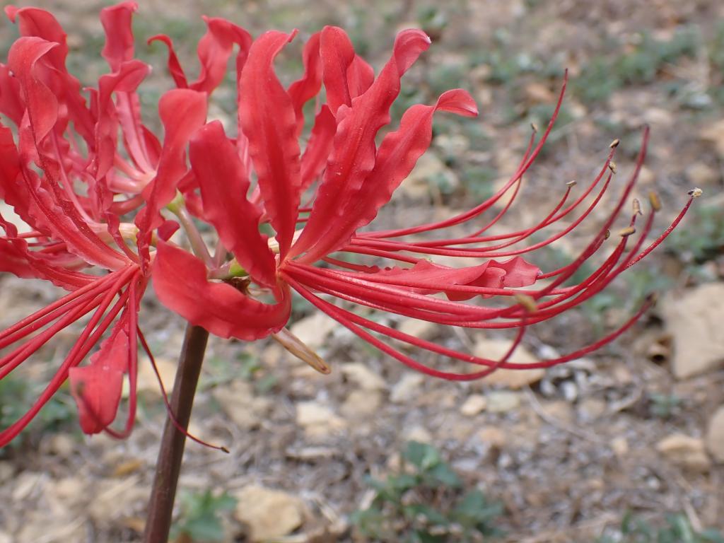 紅花石蒜、金花石蒜是台灣原生種,其「花、葉永不相見」,花開葉落、花落葉發,聽來悲傷,「分離」是它的花語,在日本又被稱為彼岸花,有接引生死之意。然而,石蒜花形張裂蜷曲、顏色鮮豔,紅花石蒜紅如火;金花石蒜黃似金;玫瑰石蒜、紅藍石蒜更有紫紅、淡紫、粉紅等顏色,花瓣尖還帶有一抹藍,是台灣極具特色的野生季節花卉。