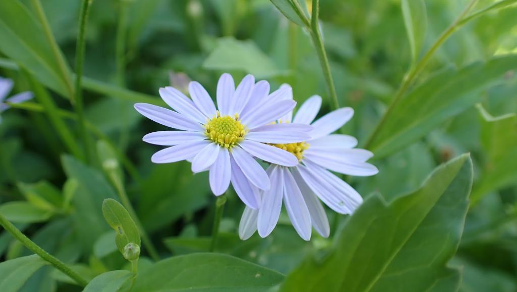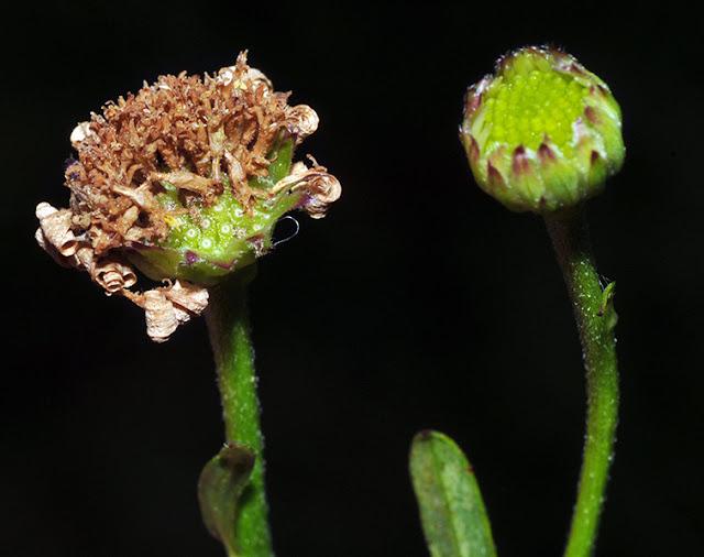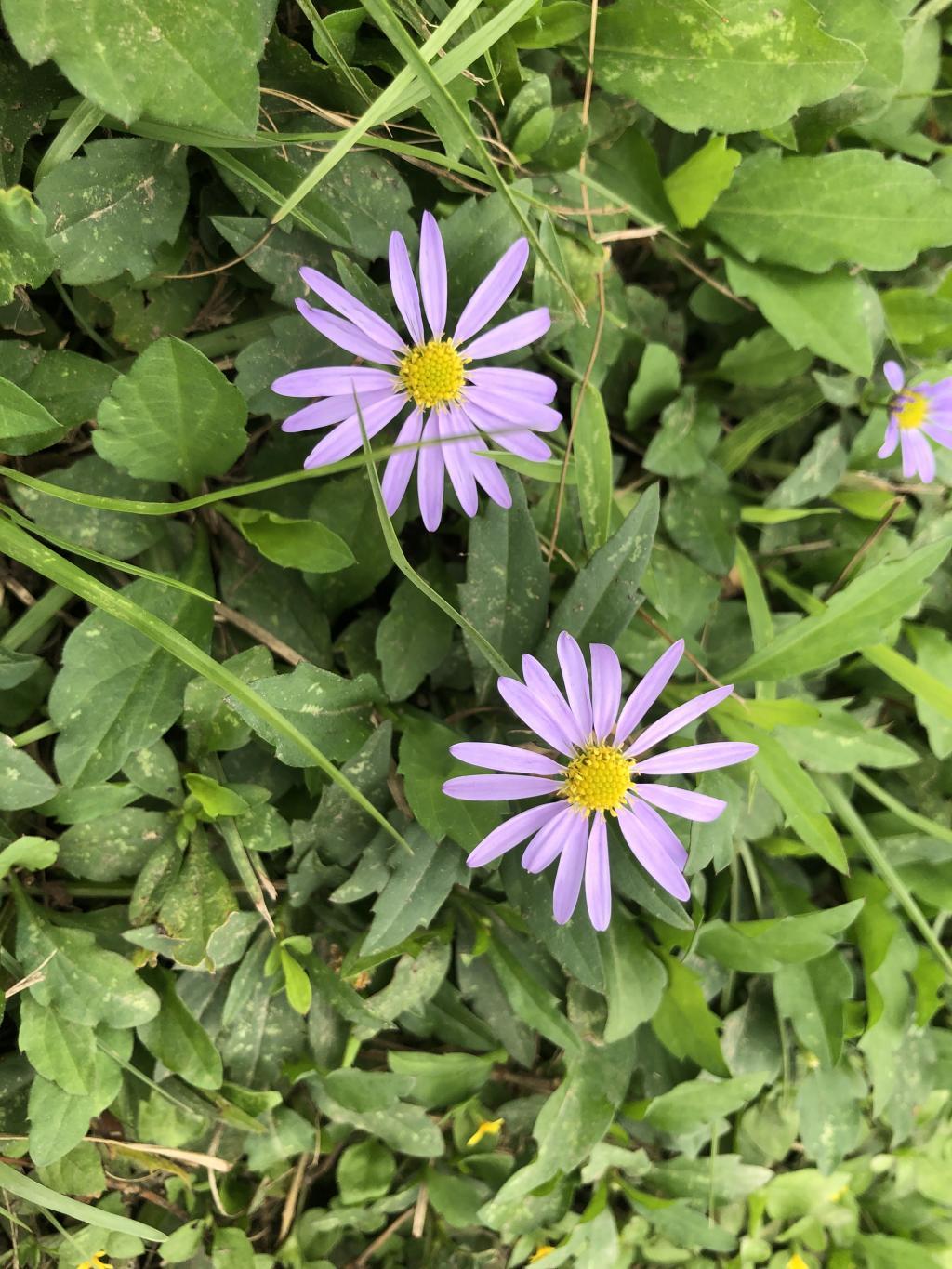 頭花頂生,直徑 2.5 公分;舌狀花藍或粉紅色。