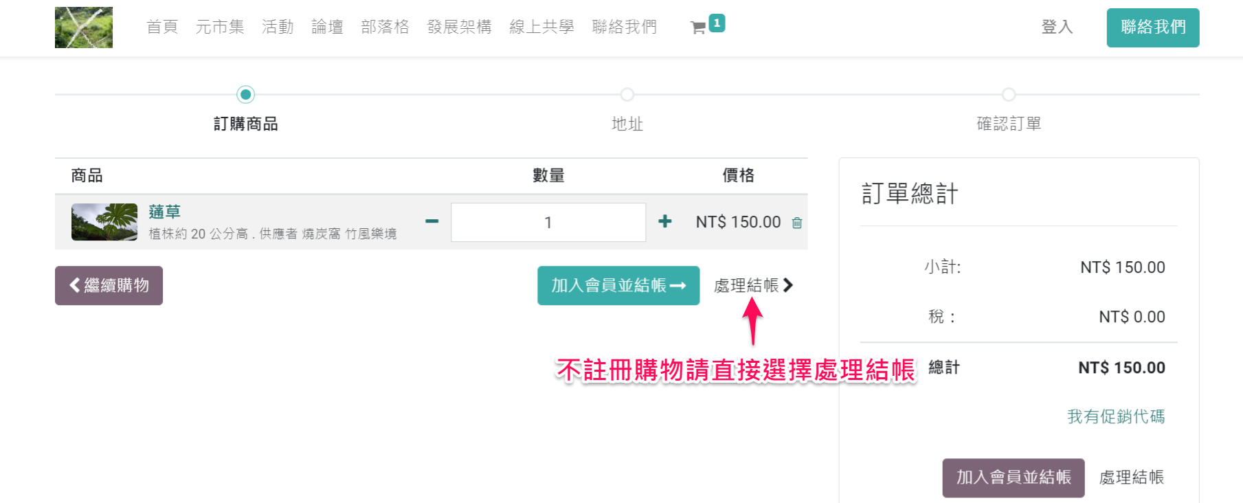 未註冊帳號者可以在進入購物車後,直接選擇處理結帳。但需要在訂購單留下聯絡方式 (姓名、電話、寄送地址)。