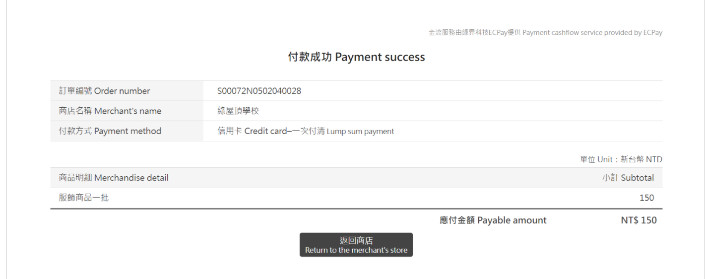 5. 如果是線上刷卡或以網路 ATM進行付款完成後,將會出現付款成功訊息。如果失敗,請返回上一頁多試幾次,系統不會重複扣款。付款成功後,接著點選返回商店。