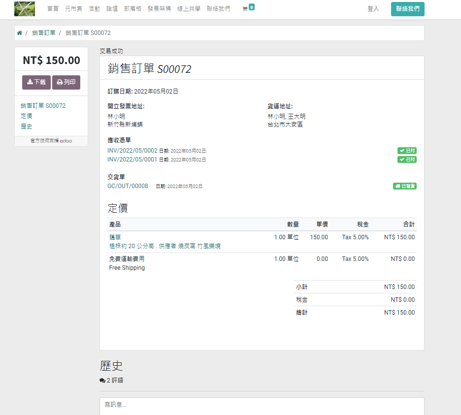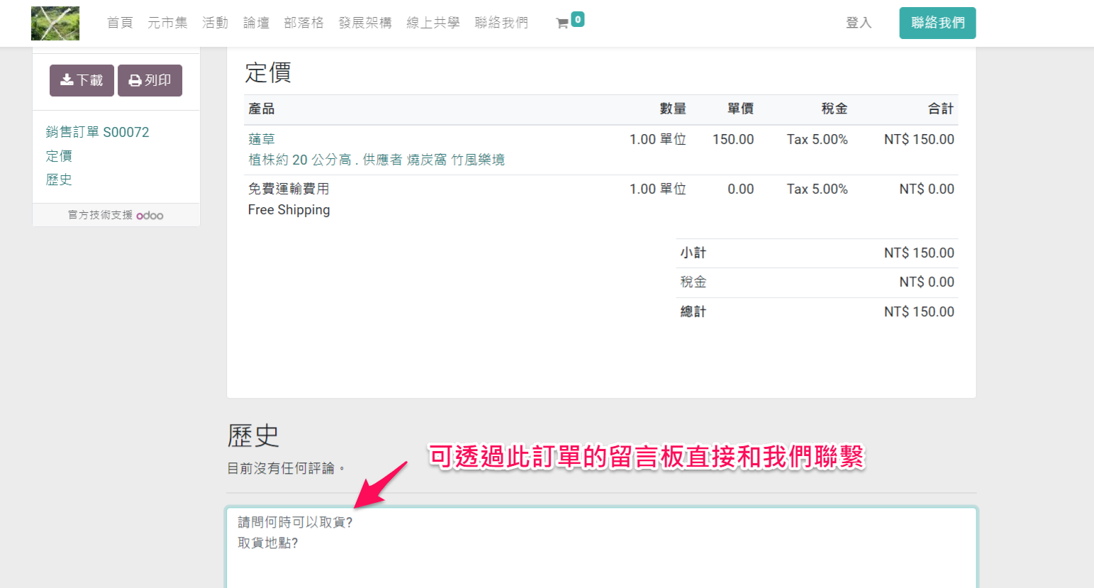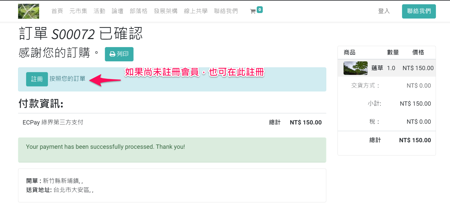 6. 返回商店後,系統會出現訂購單明細,請檢查是否無誤。S 開頭的編號便是您此次購物的訂單編號,後續的聯繫溝通即是以此編號進行。